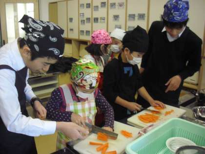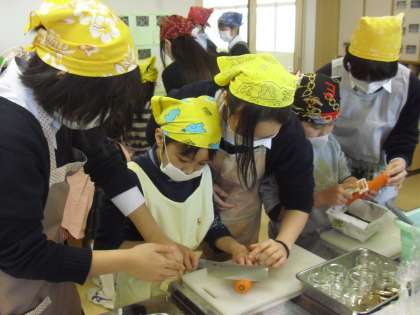 3年生の総合的な学習の時間の授業の様子です。中学2年生との交流授業でコンフィチュール作りに取り組んでいるところです。作り方がすべて中学生が教えてくれます。中学2年生が6年生の時の1年生が、今の3年生なのです。