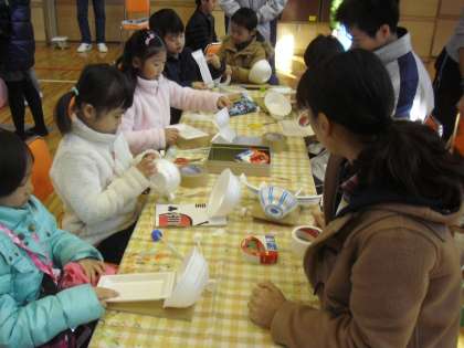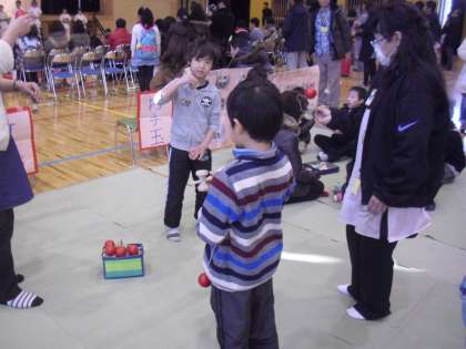 体育館では、BOPが、コマやけん玉、お手玉などの昔遊びコーナーや風力で走る車の工作コーナーを開き、たくさんの子どもたちが遊びや工作を楽しんでいます。