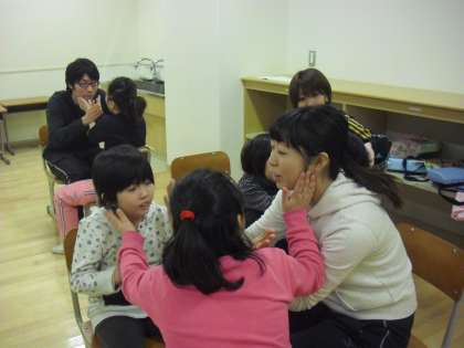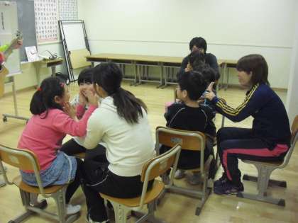 ひかり学級の音楽の授業の様子です。先生たちもいっしょに、仲良くスキンシップとコミュニケーションを図る歌を歌っているところです。子どもたちもとても楽しそうです。
