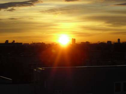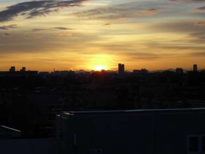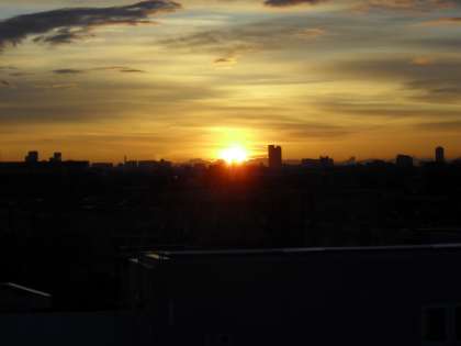 屋上から見た今朝の日の出の様子です。雲がかかっていますが、朝日に照らされた暁色の町並みがきれいです。今日も子どもたちが元気に学校生活を送ることを願っています。