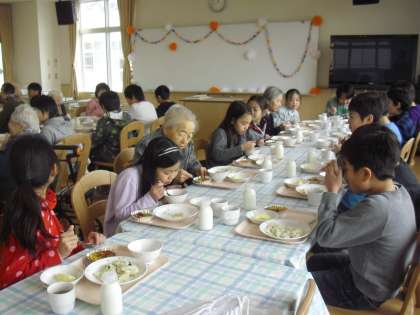 4年生のふれあい給食の様子です。芦花ホームのみなさんをお招きしての会食です。今日は、青菜のピラフ、パンプキンオムレツ、白菜とハムのスープ、りんごです。給食を食べながら楽しいひとときを過ごします。