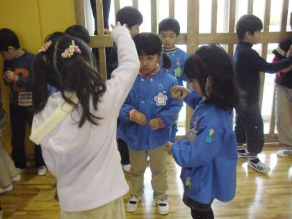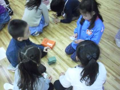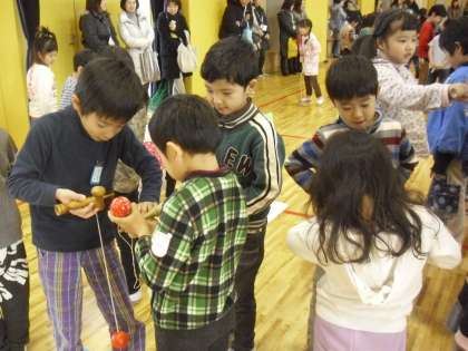 けん玉、百人一首、ヨーヨーのコーナーの様子です。1年生は、遊び方をやって見せてあげながら、やり方を一生懸命に教えています。相手のことを考えながら接していることが伝わってきます。