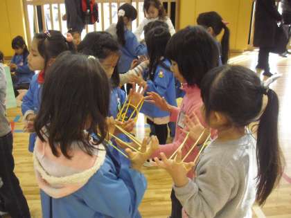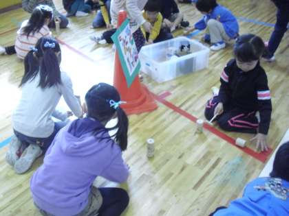 だるま落とし、あやとり、お手玉のコーナーの様子です。相手が楽しめるようにという思いが教える様子から伝わってきます。自分たちが4月から2年生になるという自覚の現れのようです。園児にとっても遊びを通して小学校の生活に関心を高めたと思います。互いに意義のある交流となりました。