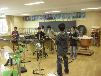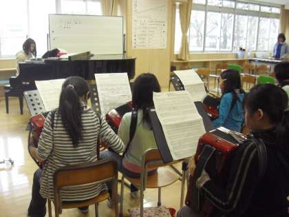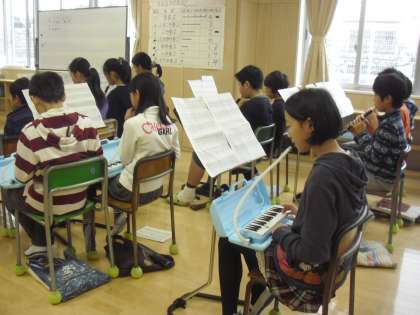 6年生の音楽の授業の様子です。「シンクロBOM−BA−YE」の合奏に取り組んでいるところです。感謝の会で演奏する予定です。感謝の気持ちが伝わるように丁寧に仕上げていきたいと思います。