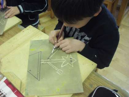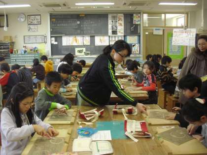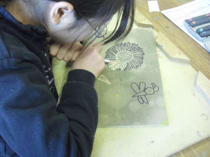 4年生の図画工作の授業の様子です。木版画「ふしぎな花」の制作に取り組んでいるところです。彫刻刀の扱い方に注意しながら、ゆっくりと彫り進めています。印刷したときの絵柄をイメージしながら彫っています。