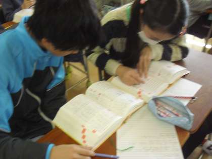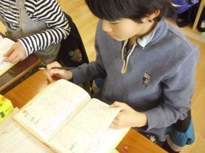 6年生の国語の授業の様子です。漢字の成り立ちについて学習しているところです。漢字辞典を活用して部首を中心に調べています。辞書の使い方が身に付いているので、調べたい部分をすぐに引くことができます。