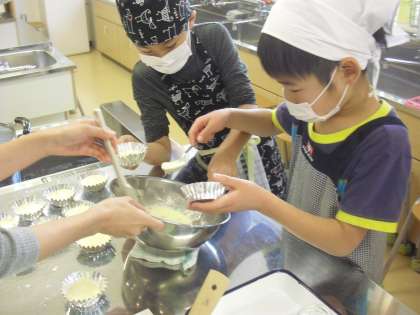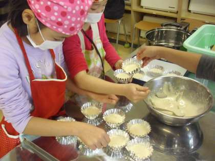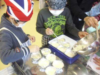 3年生の総合的な学習の時間の授業の様子です。先日、中学生といっしょに作ったコンフィチュールを使って、お礼の蒸しパンを作っているところです。作った生地を一つ一つ丁寧にカップに入れていきます。