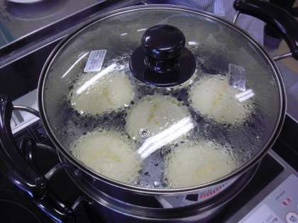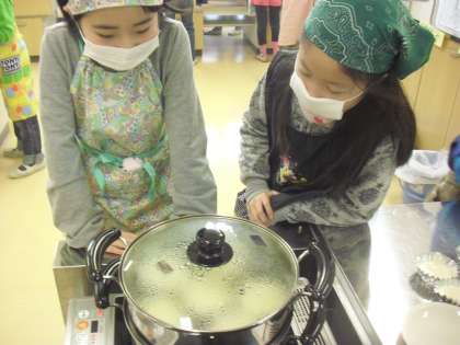 蒸し器に入れて、蒸します。「中学生のお兄さん、お姉さん喜んでくれるかな」と蒸し上がるのを楽しみに見つめる子どもたち。心をこめて作りました。