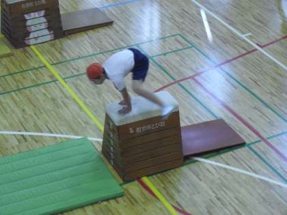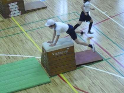 5年生の体育の授業の様子です。跳び箱運動に取り組んでいるところです。調子よく跳ぶことができるように、跳ぶリズムを大切にしています。調子よく跳ぶことができるとドームも力強くなってきます。