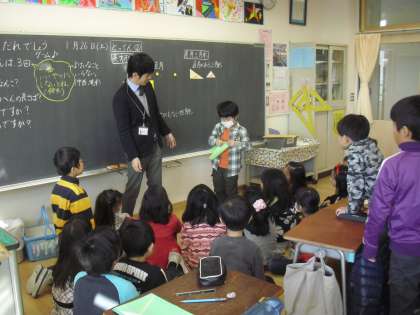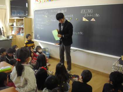 2年生の算数の授業の様子です。図形の学習で、直角について学習しているところです。色画用紙を使いながら授業を進めています。具体物を活用することで視覚的にもとらえやすくして理解を深める工夫をしています。