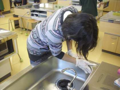 6年生の家庭科の授業の様子です。快適な住まい方の学習の一環として、家庭科室の整理整頓や清掃の仕方について話し合い、自分たちで分担して清掃に取り組んでいるところです。普段は行わない部分を中心にきれいにしました。