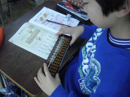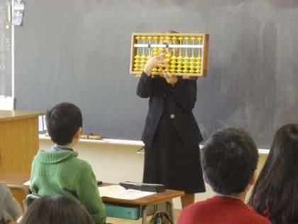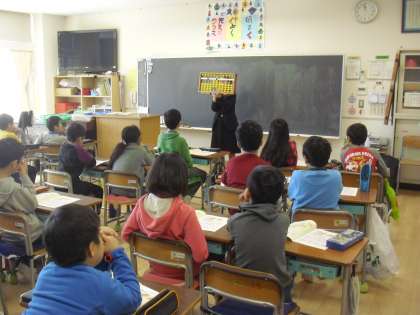 3年生の算数の授業の様子です。講師の先生をお招きしてのそろばん教室です。まず、そろばんによる数の表し方について学習しているところです。3日間かけて、そろばんを用いた簡単なたし算やひき算を学びます。