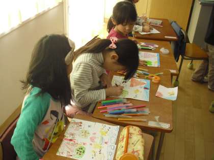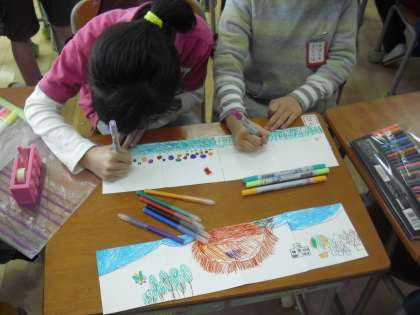 1年生の図画工作の授業の様子です。「つづき絵どんどん」の制作に取り組んでいるところです。自分たちのイメージした世界を小さな画用紙に描き足しながら広げていきます。友達とアイデアを出し合いながら楽しく描いています。