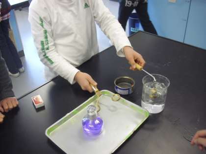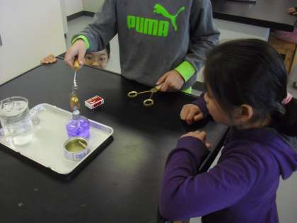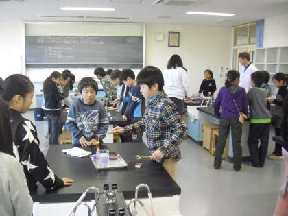 4年生の理科の授業の様子です。「金属の性質」について学習しているところです。金属を温めたり冷やしたりして、その変化を調べます。アルコールランプを使って熱したり、氷水に入れて冷やしたりしながら体積は変化を調べる実験をしています。