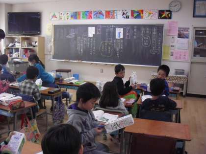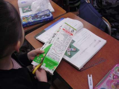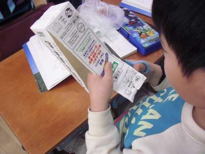 2年生の国語の授業の様子です。説明文「牛乳パックで、こまをつくろう」の学習に取り組んでいます。教科書に書いてある作り方の手順を読み取りながら作成しているところです。理解したことが具体的な形となって表れる学習です。文章を何度も読みながら作業を進めています。