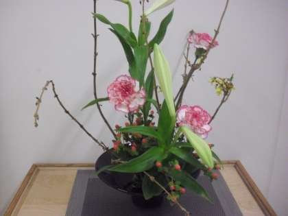 中学校生け花部の作品です。上は小学校保健室前の作品です。花材は、チューリップ、葉ボタン、スプレー菊、レンギョウです。下は、職員室前の作品です。花材は、レンギョウ、鉄砲ユリ、カーネーション、ヒビリカムです。