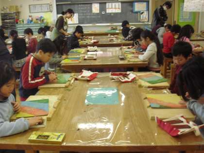 4年生の図画工作の授業の様子です。切り出し刀、丸刀、平刀、三角刀それぞれの刀の扱い方の練習をしているところです。それぞれの彫った線で描く自分のデザインをイメージしていきます。用具の特徴を生かしながら表現することを身に付けていきます。