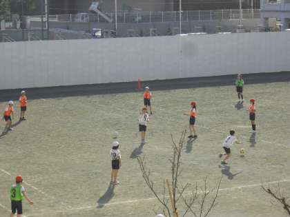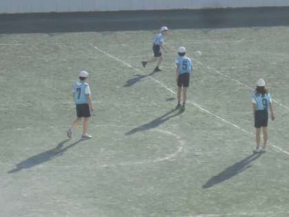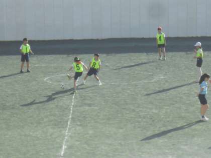 5年生の体育の授業の様子です。サッカーの学習をしているところです。チームでパスの練習をしています。高学年のボール運動では、チームの時間を取り入れます。話し合い、練習等、チームの力を高めるために必要な活動を自分たちで決めて取り組みます。主体性をはぐくむ学習です。