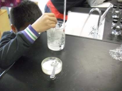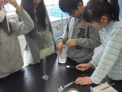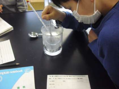 5年生の理科の授業の様子です。「物の溶け方」の学習をしているところです。今日は物が水に溶ける量には限度があるのかどうかを調べています。食塩やミョウバンを少しずつ加えながらかき混ぜて溶かしていきます。ある子が「溶けた食塩はどこにいったのだろう」とつぶやきました。このような気付きが学習を深めていきます。