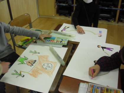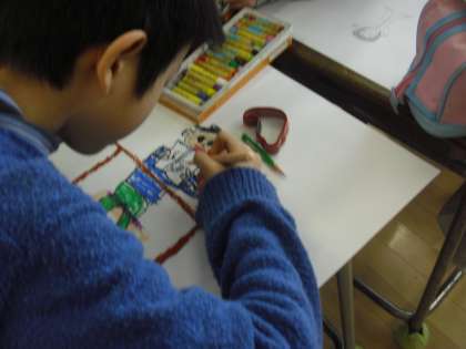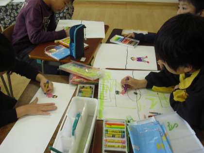 3年生の図画工作の授業の様子です。休み時間に自分が一番好きなことをしている様子を描いているところです。自分の好きなことなので、子どもたちも楽しく描いています。楽しさやおもしろさが表情や動きから伝わってきます。のびのび表現することは大切です。