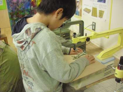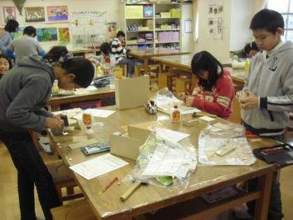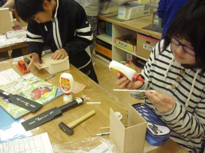 6年生の図画工作の授業の様子です。木工作品「一枚の板から」の制作に取り組んでいるところです。小物入れ、マガジンラック等、自分がデザインした生活に役立つ物を実際に作っています。正確に寸法を測り、切ることが求められます。造形的な力をはぐくむ学習です。
