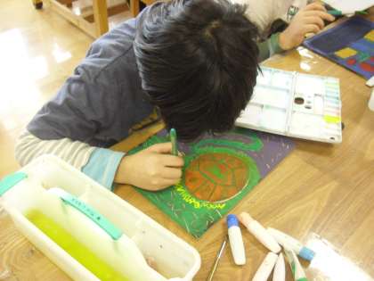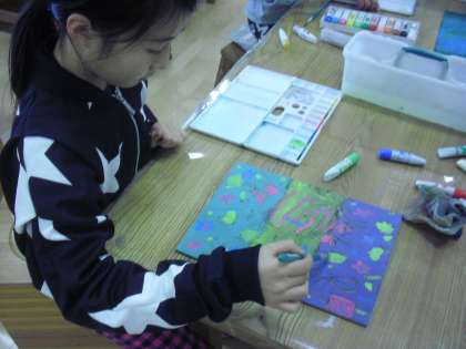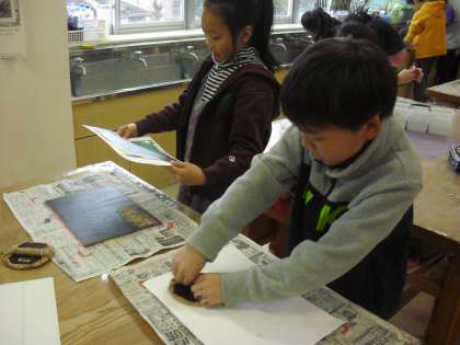 4年生の図画工作の授業の様子です。木版画「ふしぎな花」の制作に取り組んでいるところです。版画が完成したら、板に絵の具で色つけをして、電動糸のこを使ってパズルを作成します。造形遊びを通して、子どもたちは発想が広がっていきます。