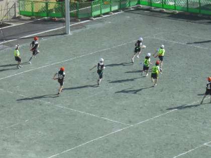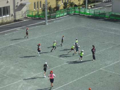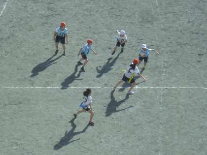 4年生の体育の授業の様子です。タグラグビーのゲームを行っているところです。腰に付けているタグを相手に取られないようにして、相手の陣地にボールを運びます。子どもたちも回を重ねるごとにルールを理解し、動きがよくなってきました。
