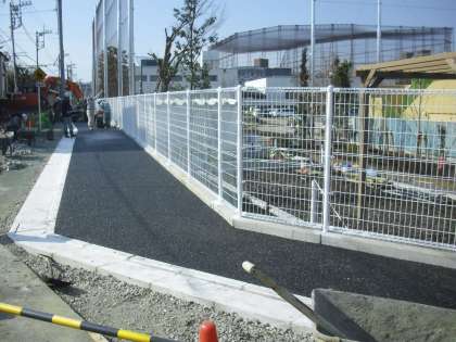 八幡山保育園の角から見た南門側の歩道の拡張工事の様子です。旧校庭の一部を使い、幅が広くなりました。アスファルト工事が進んでいます。