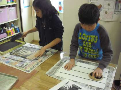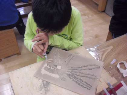 5年生の図画工作の授業の様子です。木版画に取り組んでいるところです。ある程度彫り進めたら試し刷りをします。印刷した具合を確かめながらイメージを膨らませていきます。子どもたちの創造性が広がります。