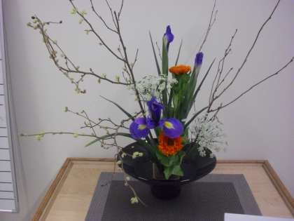 中学校生け花部の作品です。上の写真は職員室前の作品です。花材は、アイリス、キンセンカ、レースフラワーです。下の写真は、中学校東昇降口前の作品です。花材は、ヒメミズキ、スプレーストック、スイートピー、チューリップです。いつも、落ち着きややすらぎを与えてくれます。