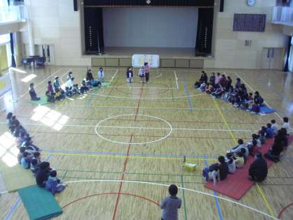 本校の体育館で行った4校交流会の様子です。烏山小学校、明正小学校、上祖師谷小学校の特別支援学級とひかり学級の子どもたちとの交流会です。司会は、ひかり学級です。各学級が出しものを披露します。ひかり学級はロンドン橋を行いました。