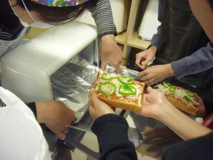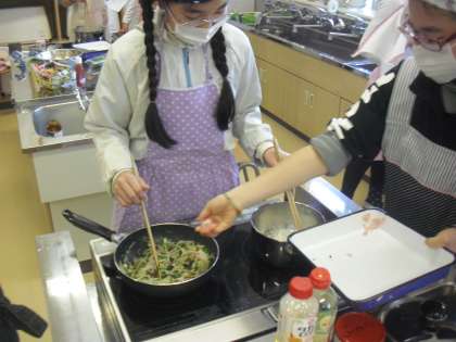 グループ毎に協力しながら作業を進めています。家庭科専科の教員が各グループを回って必要な指導をしています。家庭科室にいい香りが広がってきました。子どもたちは創作料理づくりに夢中です。