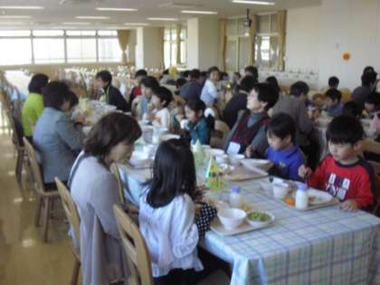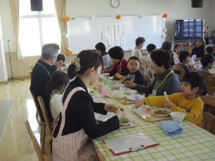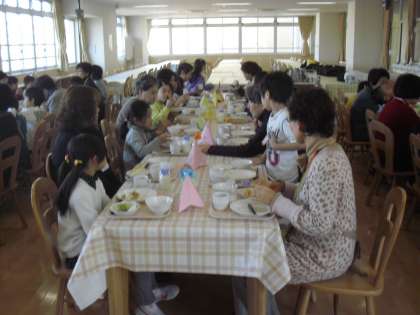 会食の様子です。大勢で食べる給食は楽しそうです。祖父母の方々にも子どもたちにも笑顔が見られます。会食後には「雨ニモマケズ」の暗唱と歌を聞いてもらいました。祖父母の方々の温かな眼差しに見まもられた子どもたち。様々人とのかかわりを通して「ふれあい力」もまたアップしました。
