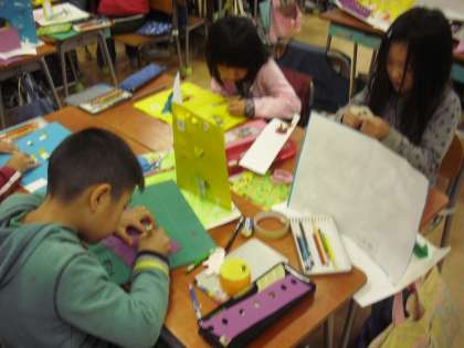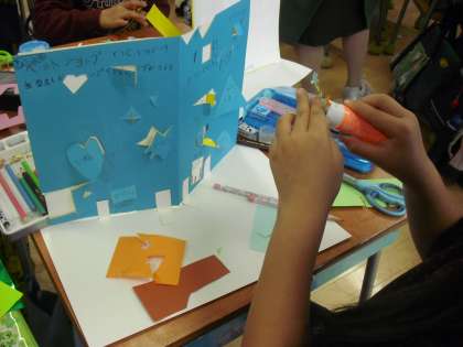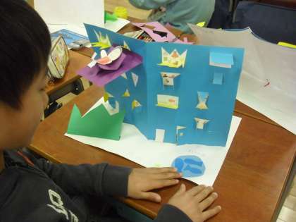 2年生の図画工作の授業の様子です。「窓を開けたら」の制作に取り組んでいるところです。建物のが立ち、窓からはいろいろな仲間が顔をのぞかせています。自分が想像した世界です。子どもたちは最後の仕上げに夢中です。
