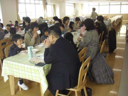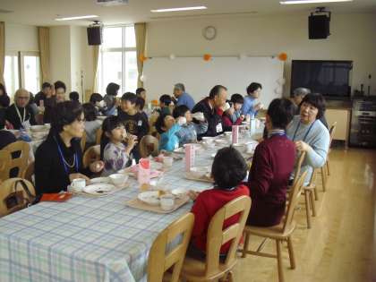 会食の様子です。子どもたちと会話を交わしながら祖父母の方々も楽しそうです。このような機会を通して、子どもたちは人とかかわる力を身に付けたり、相手の立場を思いやる大切さにふれたりしていきます。心の成長にもつながります。