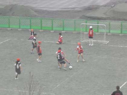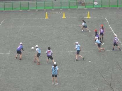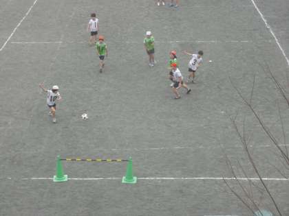 5年生の体育の授業の様子です。サッカー型のゴール型ゲームに取り組んでいるところです。学習の導入時は、ボールに集まる団子状態になりがちですが、学習が進むにつれてサイドを広く使うようになり、相手のいない場所に移動しようします。自分と相手と見方の位置関係が見えるようになるとゲームの様相がよくなります。