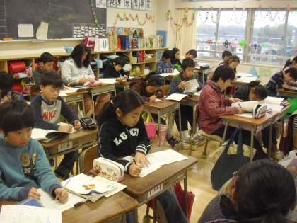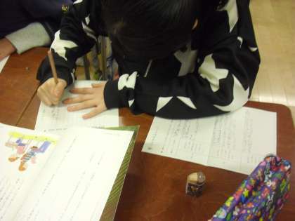 4年生の国語の授業の様子です。「二十歳のわたしへ」の学習に取り組んでいるところです。十年後の自分を想像して手紙を書きます。2分の1成人式に向けての取り組んでいる4年生にとって関連する学習です。