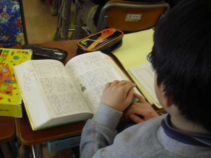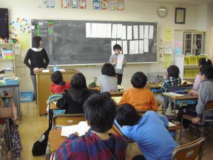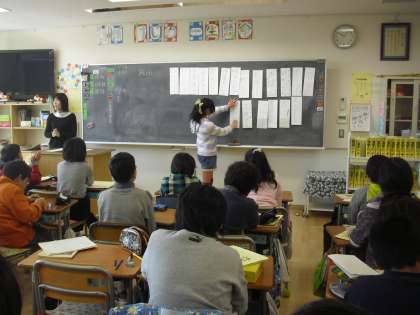 5年生の教科「日本語」の授業の様子です。自分が好きな漢字熟語を選んで、その意味をクラスに紹介しているところです。クラスの人数分だけの熟語と出会うことができました。発表し合うことで互いの学びにもなります。