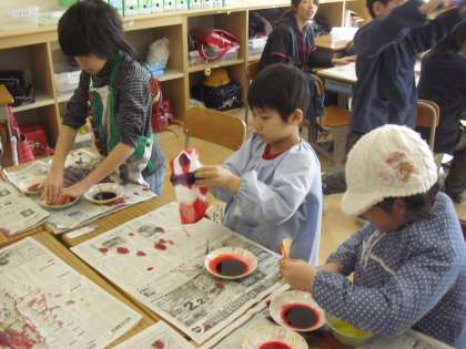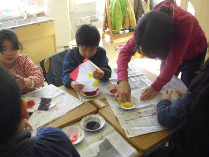 ひかり学級の図画工作の授業の様子です。和紙を折って染める「折り染め」を行っているところです。和紙を開くときれいな模様が描かれています。子どもたちもその変化に目を輝かせていました。