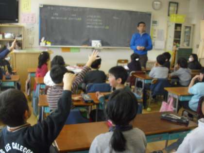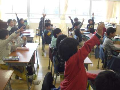 2年生の生活科の授業の様子です。自分の成長を振り返るために、幼い頃と比べてできるようになったこと、1年生のときと比べてできるようになったことを手を挙げて発言しているところです。友達の発言を聞きながら共感している子どももたくさんいます。