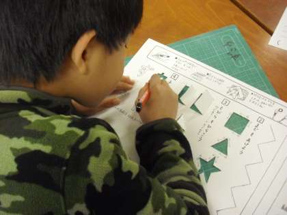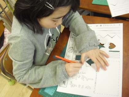 3年生の図画工作の授業の様子です。安全なカッターの使い方について学習しているところです。練習用のワークシートの線や型をカッターで切り取っていきます。「真っ直ぐに引く」という基本をしっかりと定着させ、制作活動に生かしていきます。