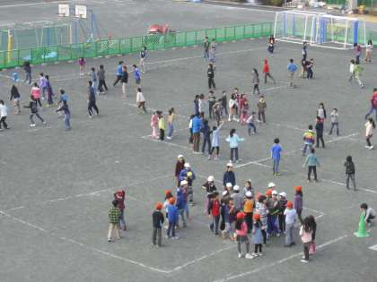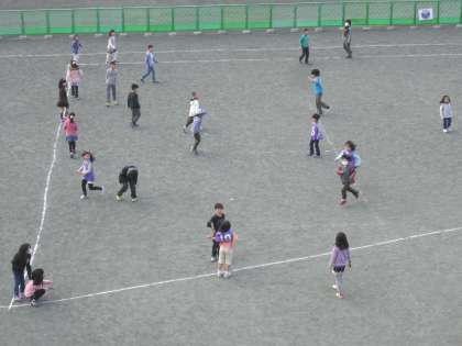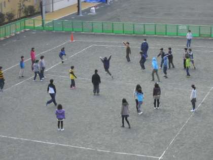 今朝の学級遊び「みんなでたのしく」の様子です。2年生と5年生が遊んでいます。ドッジボール、鬼遊び等、子どもたちは元気に遊んでいます。グリーンフェンスの向こう側の校庭も整備が進んでいます。全面使用できる日が楽しみです。