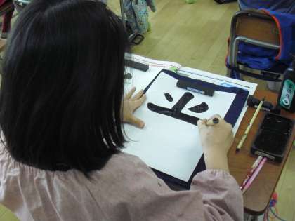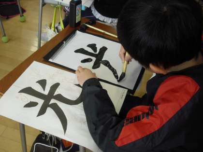 3年生の書写の授業の様子です。課題文字「光」に取り組んでいるところです。手本を見ながら、形を整えて一筆一筆丁寧に書いています。子どもたちが真剣になればなるほど教室が静かになります。納得のいく文字を書き上げていました。