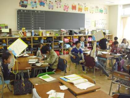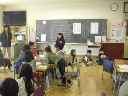 1年生の国語の授業の様子です。クイズ大会を行っているところです。クイズを作るだけでなく、大事なことを落とさないようにしながら、友達の話やクイズを興味を持って聞くことが学習のねらいです。一人一人が出題しています。クイズを通して友達のことについても理解ができたと思います。