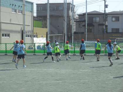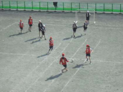 5年生の体育の授業の様子です。サッカーの学習に取り組んでいるところです。足でボールを操作する運動は、思う方向にボールを運ぶことが簡単ではありませんが、コートが広いので空いている場所が見つけやすい利点もあります。子どもたちの全力走がゲームに勢いをつけます。