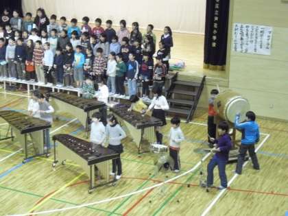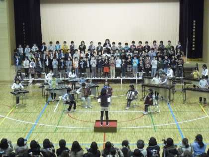 踊りに引き続き、合奏「ソーラン節」を披露します。ダンスとはまた違った雰囲気の音楽表現です。和大鼓の響きを生かしながら、全員で気持ちを合わせて演奏しました。