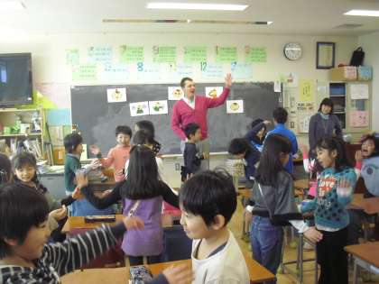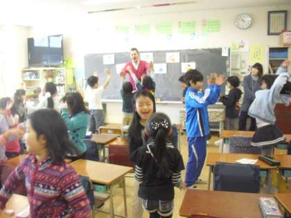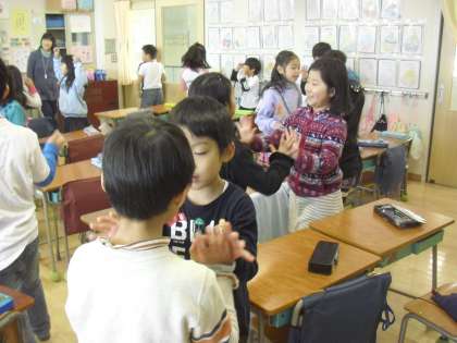 2年生の英語活動の授業の様子です。ALTの先生と英語に親しむ活動を楽しんでいます。友達と歌いながら手を合わせてあいさつする活動です。いろいろな相手とあいさつをします。コミュニケーションの要素を上手に取り入れた活動です。