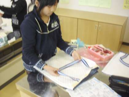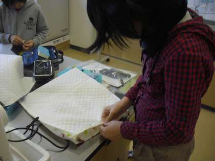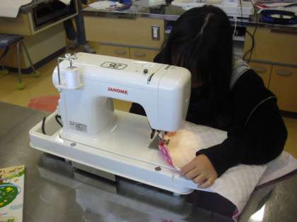 5年生の家庭科の授業の様子です。生活に役立つものの製作に取り組んでいるところです。ミシンの扱いにも慣れ、一人で準備ができるようになりました。縫うところに印を付け、ミシンで真っ直ぐに縫います。これまで学習した知識や技能を生かしながら主体的に作業を進めています。