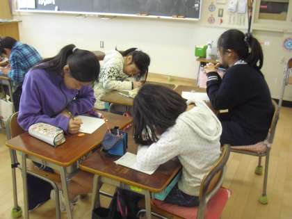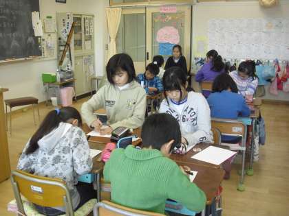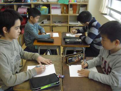 3年生が6年生の似顔絵を描いているところです。似顔絵は「6年生を送る会」の際の装飾になります。机を向き合わせて真剣に描いています。よくみると6年生も相手の3年生の似顔絵を描いています。互いに相手のことを考えながら活動することで、かかわりあいに豊かさを与えてくれます。