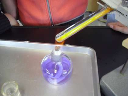 4年生の理科の授業の様子です。「水の性質」について学習しているところです。今日は、水のあたたまり方を調べる実験を行っています。試験管のなかに水とサーもテープを入れ、熱したときの色の変化であたたまり方を確認します。実験の方法や結果は、ノートにまとめます。高学年を前にノート作りも意識させたいと思います。